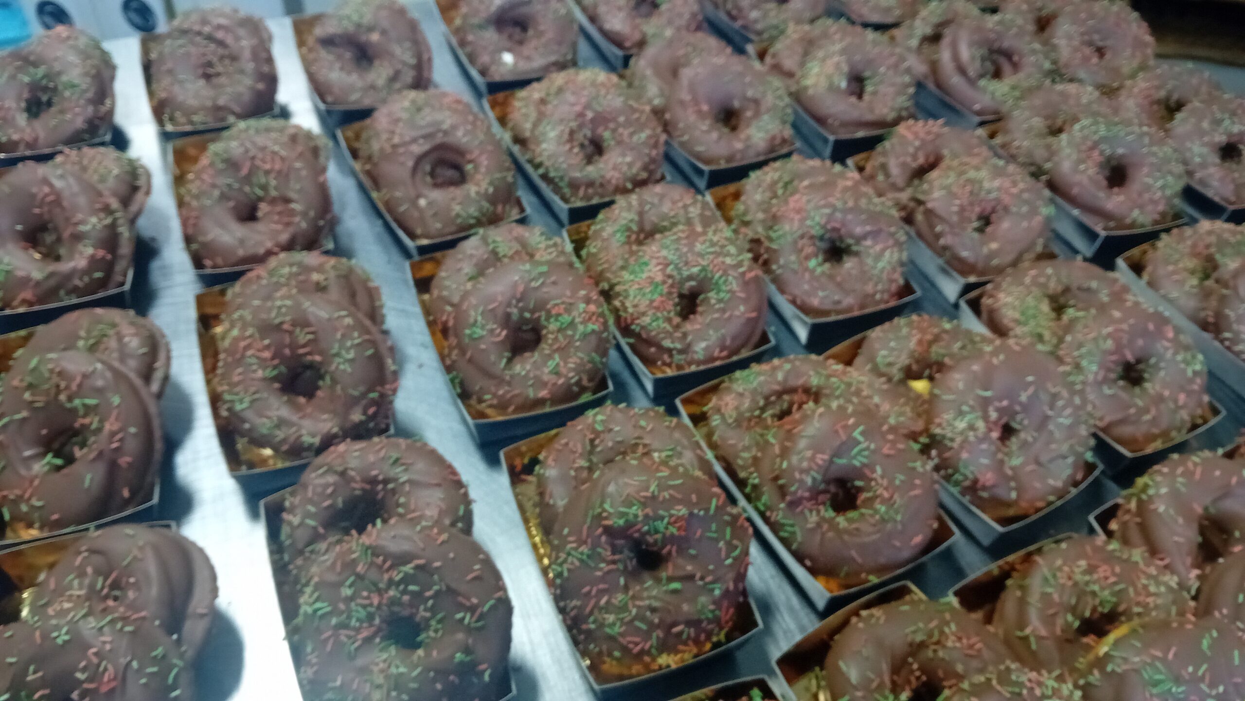 Gevulde kerstkransen, 3 stuks €6,95. Gevuld met vanille-truffel vulling en karamel.
